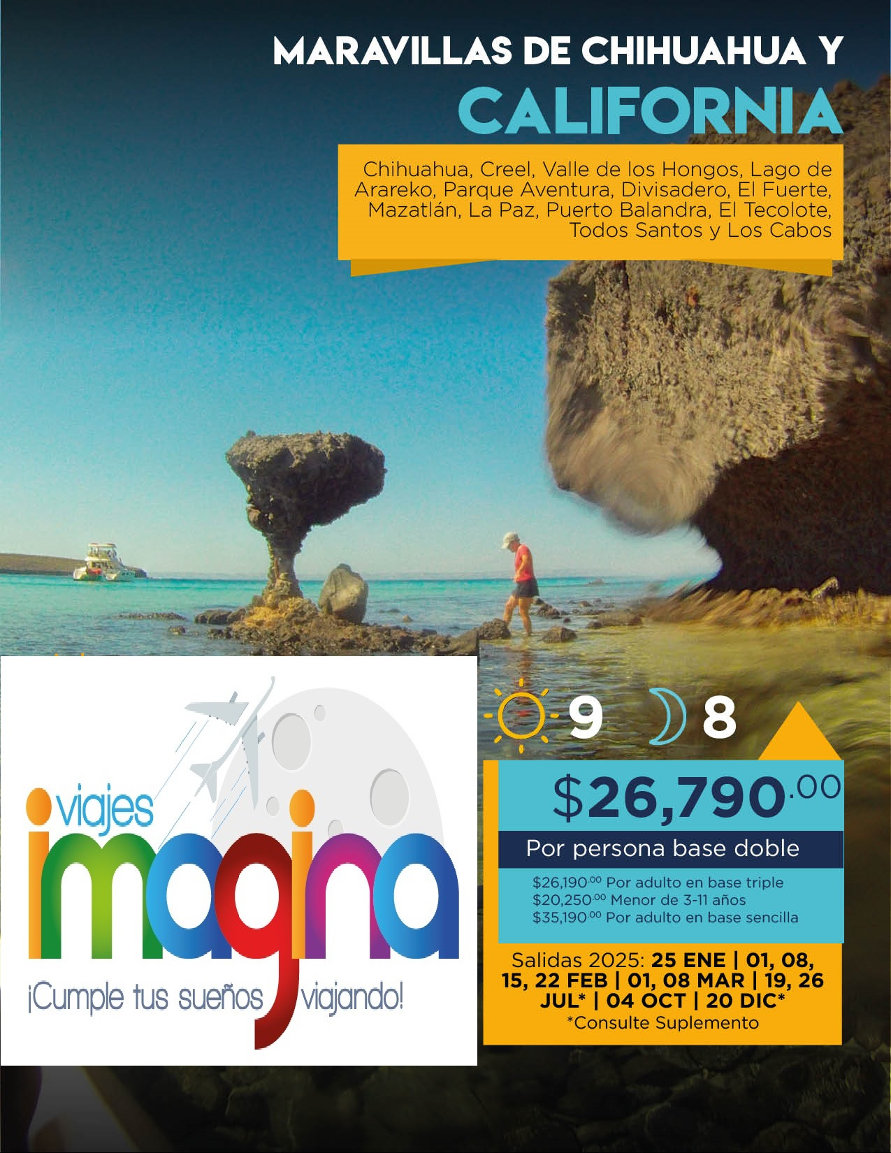 Visitando: Chihuahua, Creel, Valle de los Hongos, Lago de Arareko, Parque Aventura, Divisadero, El Fuerte, Mazatlán, La Paz, Puerto Balandra, El Tecolote, Todos Santos y Los Cabos.